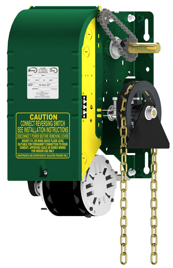 The operator can be wall, hood, or shelf mounted on either side of the door. It incorporates the patented Hoist-a-matic®, a self-engaging chain hoist for manual operation, which simplifies operation and installation.