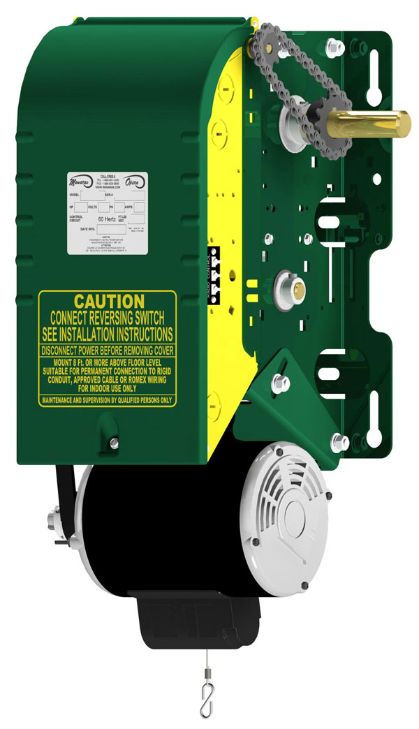 The operator can be wall, hood, or shelf mounted on either side of the door. It incorporates a floor level disconnect mechanism for manual operation.