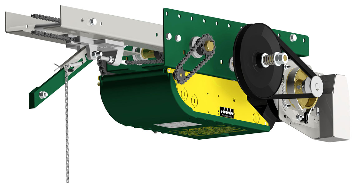 The OTBH is a low headroom trolley operator designed for use on industrial standard lift sectional doors. It incorporates a drum-band type solenoid brake.